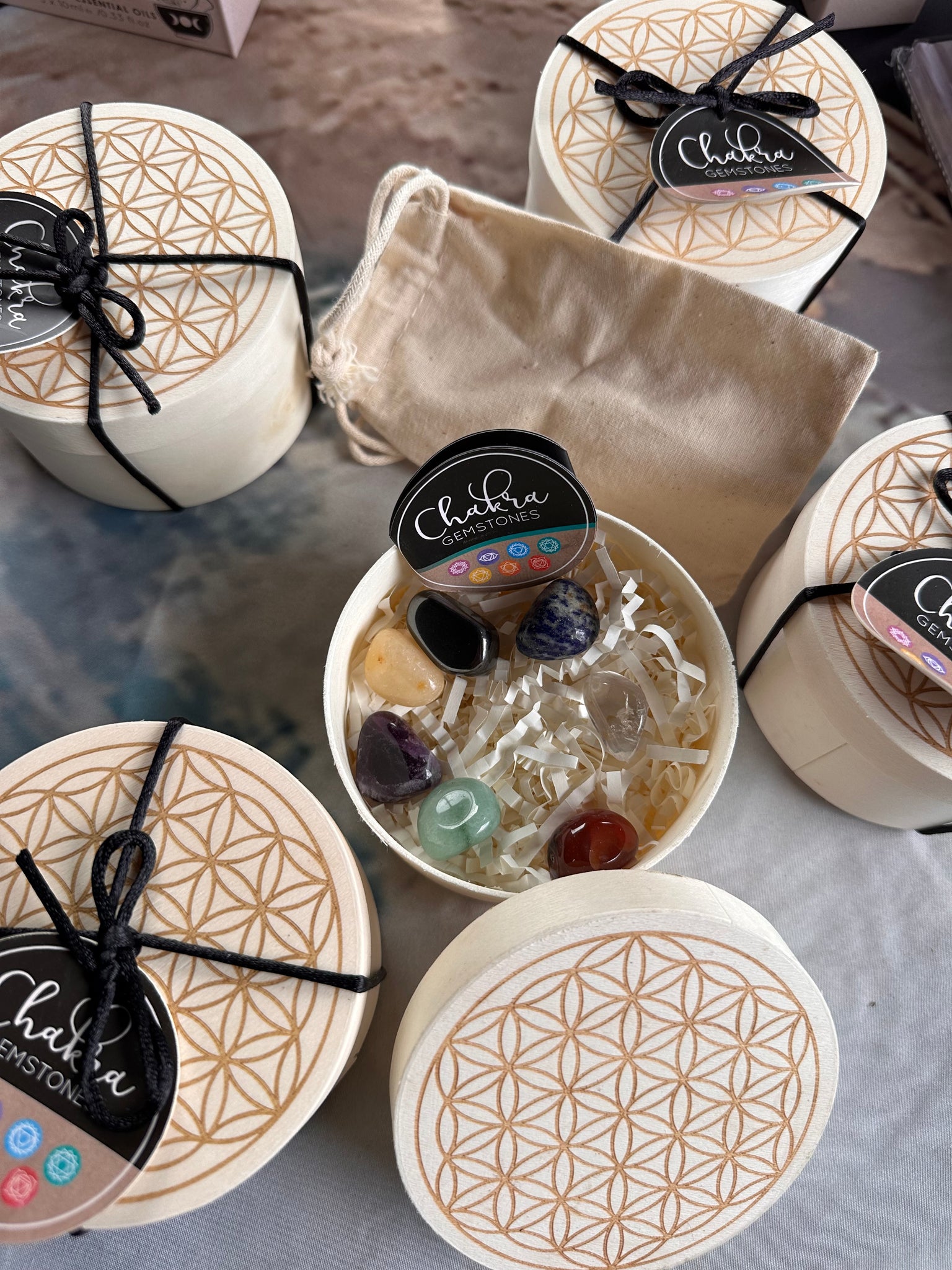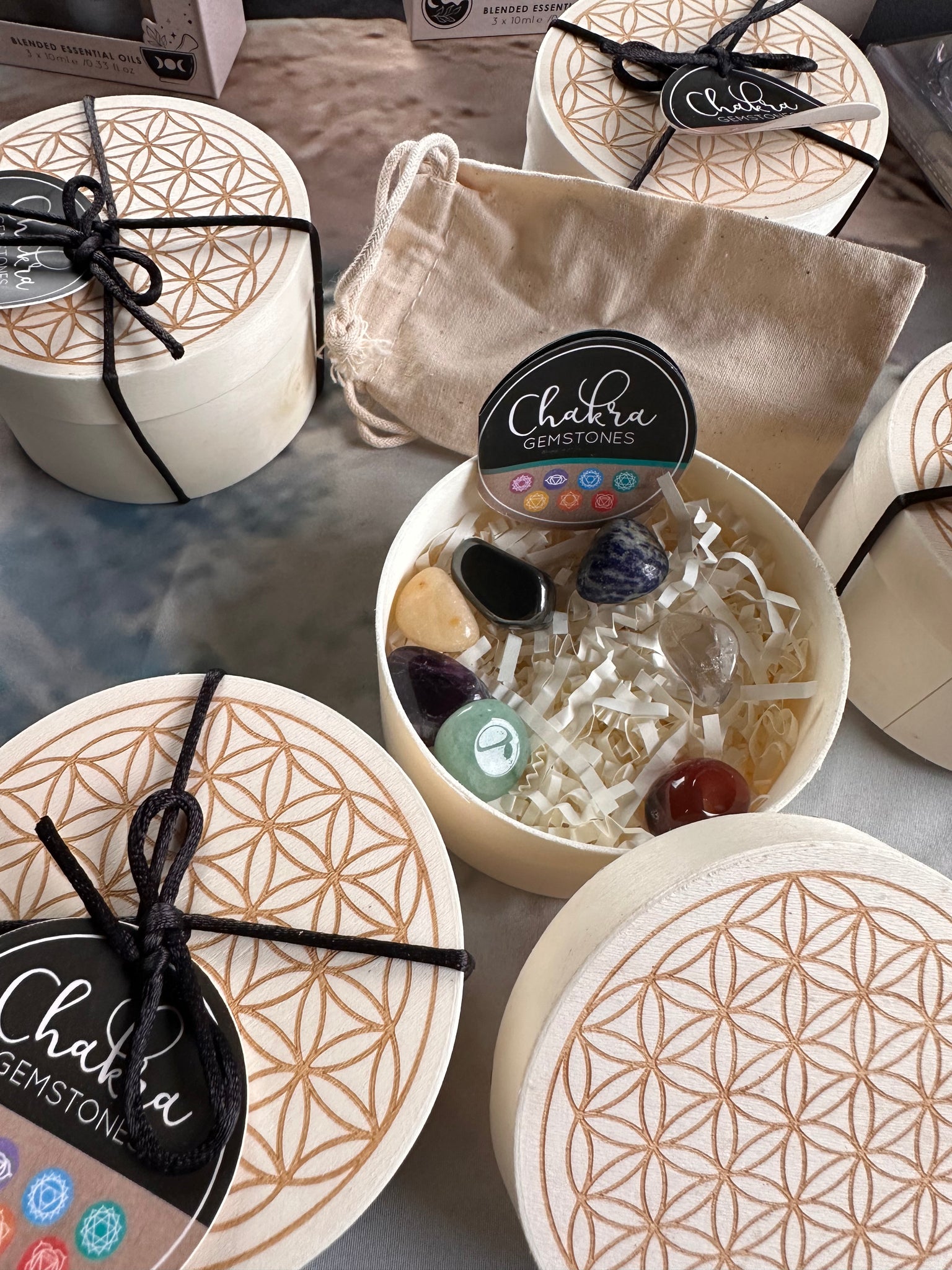 Inside the wooden Flower of Life gift box you will find seven smooth tumbled crystals, each chosen to support and balance one of the seven chakras. The set also includes a soft cotton drawstring bag, perfect for carrying your crystals with you or keeping them safe on your altar.